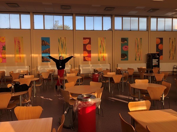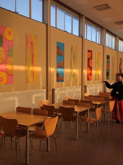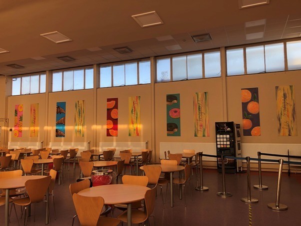 Morgan is in year 13 studying A Level Art at Didcot Sixth Form and has been working hard on producing these large-scale paintings for staff, students and visitors to enjoy in this extensive canteen space. There are 10 in total forming her major art project's final outcome so, not only are we the beneficiaries of her wonderful art, but she also has an ambitious and brave project to support her plans to study Interior Design at university.